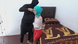 A beautiful girl wearing a swimsuit tightly wrapped around her upper body with duct tape. Half of this girl's body could not be free and this girl oun sat enjoying it.