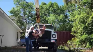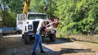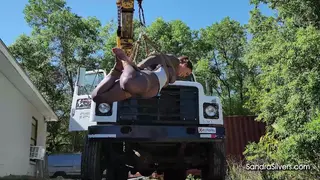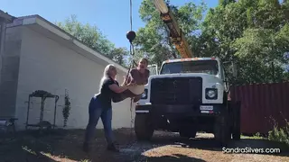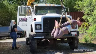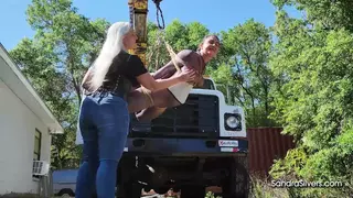 Discipline is a fast track to elevation. Sandra Silvers, a commanding MILF with shimmering silver hair and curves poured into blue denim jeans, a taut black leather corset, and boots, orchestrates bondage orgasms under the open sky. Her submissive canvas? The delectably restrained Carissa Dumond, encased in a sheer black mesh catsuit from WinterFetish, her waist cinched by a gleaming silver corset, hoisted high above the ground by a crane mounted upon the back of a rugged work vehicle. Suspended helplessly, every rope bite and pulley groan echoes Carissa’s desperate gasps as she dangles, utterly exposed.