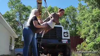 Through it all, Sandra dominates with a smile, tightening straps and cranking the winch higher to stretch her girlfriend into new realms of agonized pleasure. Every moan, every beg, every scream is a delight in this outdoor arena of BDSM artistry.