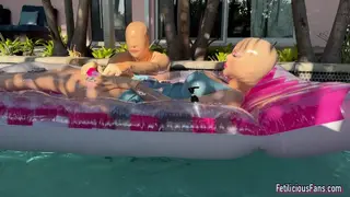 We had Latex Lara bound with clear straps on an inflatable pool bed. Rubber Jeff and I could float her around and do anything with her we liked. I put her dress down to play with her rubber nipples while Rubber Jeff was using a vibrating dildo on her pussy. Im sure she was enjoying it as I could hear her moaning.