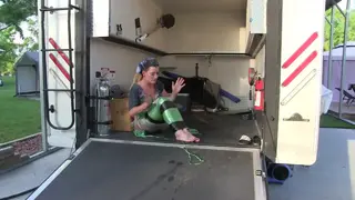 I needed to get far far away from the campsite that I was at and this nice man decided to help me out instead of kicking me out of his toy hauler travel trailer. He secured me for the first part of the ride but after a few hours, he decides that I need to be secured better as a passenger (as seen in part 1). If this is what I must do for a free ride, this is what I will take. Little did I know, he really wanted me to be safe and secure and even warm for the next part of the ride to get out of dodge. I am wrapped tightly and entirely with green packing plastic wrap and that is secured by means of electrical tape. I have microfoam covering my mouth to start as I mpphh and attempt to gag talk but as I struggle and attempt to escape, the sweat that forms, assists the stickiness to unstick from my face allowing me to talk to myself as I try to figure out what to do next. If I escape this bondage, will he continue to be a nice guy and take me further away or will be kick me out on the side of the road. I cant help but continue with my escape process of breaking the tape, stretching the plastic and getting my entire upper body out of the binds he very tightly wrapped me in. He then unexpectedly returns and opens the toyhauler door to find me pleading with my big blue eyes that i still need to keep traveling. I cant stay here. He gives me an ultimatum and leaves me to think about it. I sit there, talking it out out loud as i do remove the rest of the bondage on my body but after much self debate, I decide to stay put and continue on with this nice man that simply wanted to help me, not hurt me. He had my safety in mind the entire time. I shall continue down the road with him, with or without bondage, his choice.