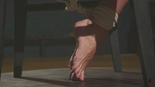 Her wrists and elbows are tied firmly behind her back, and her toes are bound together, highlighting her bare, graceful feet. She sits on a chair placed on a motorized turntable, allowing the viewer to admire every detail of her immaculate restraint from all angles.