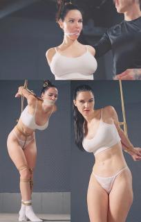 吊刑和胯绳勒得她无法忍受。为了让她无法排泄,吊刑被拉到极限,桑吉尼只能穿着白袜子踮着脚尖勉强保持平衡。她的脚踝和膝盖也被牢牢地绑住。我们用球形口塞堵住了她的嘴。她非常生气,要求被释放。但她的反对和愤怒似乎毫无作用。她挣扎着,转过身去。Sangini comes to see the new Studio in her Birthday. There, she's told they have a gift for her, but she has to choose between a strappado and a hogtie. She's confused, but chooses her favorite, the strappado. We offer to tie her up in this new Studio as a birthday present.