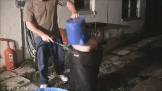 【中文brend】Lauri被拖到小院里,塞进装满冷水的垃圾桶里。我给她洗头,然后把她绑起来,放在一个小塑料池里。一桶又一桶的冷水把她冲洗干净了。Hour 21, Lauri is dragged out side wearing black out goggles and panty hose... stuffed in to a trash can full of cold water. I shampoo her and then tie her and lay her in a tiny plastic pool. Bucket after bucket of cold water rinses her clean. Then it's back to the garage where she gets some fresh clothes then she is put in a duct tape hogtie. Brenda pops in to give some advice before Les and I flog a helpless Lauri.