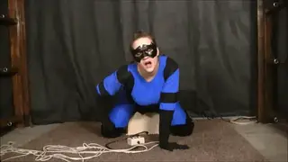 As Super B entered her refueling area Doctor Evil just waited to make his move. He grabs her and ties her up in an evil diabolical hogtie and leaves her there to struggle why he goes to ruin the world. Super B reaches down deep to have enough energy to free herself so she can recharge. Once loose she drags herself to her machine.