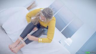 顽皮的布里先是把自己的袜子塞进嘴里,开始了她的恶作剧游戏,然后心甘情愿地接受紧紧的束缚。她被牢牢地绑在椅子上,嘴里塞着口塞,呜咽声也发不出声。她对着镜头露出惊恐的“鹿在车灯前”的表情,扭动着身体,试图挣脱束缚。