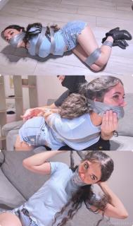 To make sure those socks stay put, Addy’s stuffed mouth is sealed with several layers of tightly wrapped gray PVC tape! The tape covers her mouth completely, from just under her cute little nose to the base of her chin, leaving her perfectly gagged. MMMMMMppppphhh!!! It seems Addy has no intention of letting a little gagging stop her sales pitch!