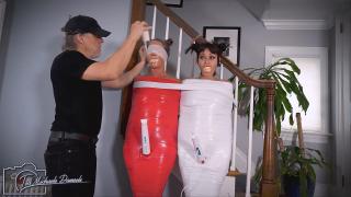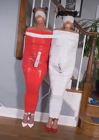 Two Damsels Mummified and Cumming - Tightly Encased and Moaning with Their Mouths Stuffed and Wet Pu