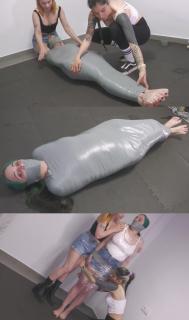 谢尔维和莉莉卡特别喜欢玩魔法卡牌游戏。她们在卡牌上花了不少钱,玩得不亦乐乎。但最近她们发现一些卡牌不见了,怀疑是她们的朋友“无敌小姐”干的。于是,她们决定趁“无敌小姐”以为自己独处的时候给她一个“惊喜”。女孩们猜对了,“无敌小姐”果然偷了卡牌!女孩们决定给她点教训。她们把“无敌小姐”的双臂分别绑在身上,脱掉她的袜子,用袜子和胶带封住她的嘴。然后,她们用透明薄膜把她裹成木乃伊,最后又用胶带把她固定住。她们把她扔到地上,羞辱她。她们还拍了一些自拍,甚至考虑把她当桌子玩卡牌!女孩们决定离开,把“无敌小姐”一个人留在那里,被绑着嘴,完全无助! “MMMMMMMMMMMPPPPPPPPPPPPPPHHHHHHHHHH!!!!!!!!!!!!”。Shelvy and Liricaa love playing magic card game. They spent a lot of money in those cards and they really enjoy it. But lately some cards are missing, and they suspect that her friend MssImperdible has something to do about it. That’s why the decide to surprise her when she thinks she’s alone. The girls were right, MssImperdible was stealing the cards! The girls decide to teach her a lesson. They tie each of her arms individually to her torso. They remove her socks and gag her with the socks and a big tapegag. Then they mummify her with transparent film. After that, they also mummify her with tape. They put her in the floor and humiliate her. They take some selfies and even consider using her as table to play with the cards! The girls decide to leave, and MssImperdible is left there, tied up and gagged, totally helpless! “MMMMMMMMMMMMPPPPPPPPPPPPPPPPPHHHHHHHHHHH!!!!!!!!!!!!!”.