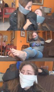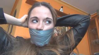 毒液正舒服地窝在沙发上,享受着她的皮夹克。她闻着、舔着,突然,切尔西从背后袭击了她,切尔西也穿着一件皮夹克。切尔西命令她脱掉皮夹克,用口塞堵住她的嘴,并用胶带把她的双手完全绑了起来。然后,她又用胶带把她绑得更紧。绑好之后,切尔西脱掉她的袜子,用袜子和胶带封住毒液的嘴。毒液兴奋起来,也用袜子和胶带封住了自己的嘴。然后,她让毒液闻她的靴子,还用皮夹克摩擦她的脸。毒液落入了一个真正的变态女匪手中!她真的麻烦大了!“呜 ...Venom is in the couch enjoying her leatherjacket. She smells and licks it. Suddenly, she's attacke from behind by Chelsea, who's also wearing a leatherjacket. Chelsea orders her to remove the leatherjacket. She gags her with a OTM gag and ties her hands completely with tape. Then she ties her up very tight with tape. Once she's tied up, she removes her socks and gags Venom with her socks and a big tapegag. The bandit gets excited, so she gags herself also with her socks and a tape gag. Then she makes Venom to smell her boots, and she rubs the leatherjacket on her face. Venom is in hands of a real pervert bandit! She's in real trouble! "MMMMMMMMMMMMMMPPPPPPPPPPPPPPPPPPPHHHHHHHHHHH!!!!!!!!!!!!!".