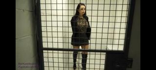 JJ is a girl who has a habit of going out late at night to snoop around the streets and sometimes private places. Tonight, an officer noticed that JJ was behaving strangely, and a woman walking alone late at night wearing black latex clothing is suspicious, so he decides to arrest JJ. Once at the station, JJ is locked in a cell. When the officer in charge reviews her file, he realizes that the woman already has several complaints against her, including for theft. Therefore, this time, simply locking her up won't be enough; they'll have to give her a special correction. So, the officer decides to put JJ under maximum stress by restraining her in the chair used for violent prisoners and putting a ball gag on her in an attempt to modify her behavior and teach her a lesson.