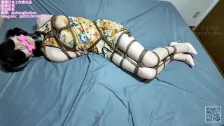 她被平放在柔软的床上,一床薄被轻轻盖住身躯,仅露出脚腕处那十道绳痕累累的捆绑——镜头贴近正面与侧面,捕捉绳索如何嵌入丝袜,勒出诱人的凹痕,足部微微颤动。被子忽被掀开,露出她全身的缚美:平躺时腿部笔直却隐隐抽搐,侧躺时曲线毕露,趴伏时臀腿紧绷。她在床上扭动挣扎,脚掌相互搓蹭,绳索摩擦出细碎声响,下身镜头捕捉股绳的律动,腿脚镜头追逐每一次无谓的挣脱,脚腕近景放大那被缚的绝望。坐起时,她更卖力地扭腿踢蹬,足底在空中划出弧线,丝袜反射着微光。