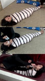 A beautiful girl is mummified in a hotel room with white duct tape reinforced with black duct tape. After this girl was helpless, her head was covered with a swimcap so that this girl struggled