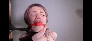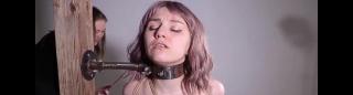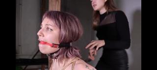 wearing a steel collar that is fixed to a pole so she is unable to turn her head to the side or tilt it. Her ankles are tied to her thighs with many ropes so she is made to stand on her knees. Her arms are securely restrained behind her back, the ropes embrace them tightly. Her hands are taped into fists. The girl finds herself absolutely helpless and in full power of her new Mistress. This position is quite unusual and definitely new to her but still, she is excited and wonders what will happen next. Maya approaches her with a whip in her hands. Although it is a great pleasure for her to have such a sexy girl as her new slave, she feels like her toy needs some training. Bramble's bare soles are appealingly faced up so Maya just can't resist playing with them. She starts whipping the girl's feet increasing the intensity of hits with every new blow. Bramble is surprised as she has never tried bastinado before. She reacts with sweet moaning. However, this reaction doesn't satisfy Maya: she longs for seeing her new pet crying. That is why the Mistress takes a bamboo cane. Caning is definitely more painful, especially for a sub with no bastinado experience, and Bramble's screams become louder and tears start flowing down her cheeks. Maya loves hearing the cries. Nevertheless, she doesn't want to disturb their neighbours. She orders Bramble to open her mouth and seals it with a ballgag, then she continues caning gagged girl's soles. Even the gag can't silence Bramble's sorrowful screaming. The girl wants to please her Mistress so bad that she endures every blow she takes, although it is tough for her. Finally, Bramble bursts out crying and Maya decides that the first lesson has gone well. This girl definitely has potential to become a good slave!