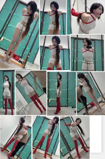 已购38次 片名:红色过膝长靴单手套超紧直臂链接股绳吊缚双口环口夹强制抬头放置