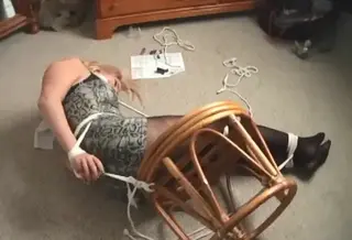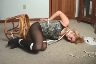 A beautiful woman in black stockings is tied up on a bench1