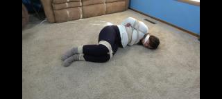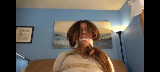 Jayme is having another slumber party and just like the last time her friends have a practical joke planned. Just like last time they pull out the rope and quickly overpower their host. Jayme is easily bound with several hundred feet of rope around her total body in her comfy leggings and sweatshirt. A large cloth is tied in Jayme’s mouth so she can’t complain to her friends. Jayme struggles in a futile attempt to escape as her friends mock and laugh at her. Soon they decide she has too much movement and it would be fun to watch a movie. They move Jayme to chair and tie her tightly to it with even more rope facing the tv screen. It looks like Jayme will be bound for a long time as movie night has just started!