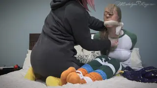 Still not satisfied and worried the cleavegag will slip, Ms. Marion slides a pantyhose hood over Madalynn’s face and leaves her to struggle on the bed all bound and gagged while she goes to get some popcorn to finish the movie!