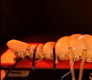Isabel Love approaches the inflatable latex sack, strips, and slides inside. Once inside it, belts are placed around it and the bondage board she is on further securing her, as the latex sack is inflated to compress her body into an even more immovable position.