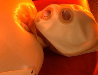 a ballgag, and a blindfold to further enhance her immobile latex experience.