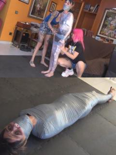 莉莉卡和娜拉选定了新的目标。黑市上有很多愿意花大价钱买像桃子这样的女孩的人。她们偷偷溜进桃子家,等着她。桃子被两个女孩制服了,无力反抗。娜拉和莉莉卡完全控制了她。她们要把她做成木乃伊。她们先用胶带把桃子的双臂分别绑在身上,然后用袜子和一个巨大的胶带封住她的嘴。她们先用保鲜膜把桃子裹起来,再用胶带封住。桃子彻底被困住了。两个女孩嘲笑她,谈论着她们能从她身上赚到多少钱。桃子这次真的麻烦大了!“MMMMMMMMMMMMPPPPPPPPPHHHHHHHHH!!!!!!!!!”。 Liricaa and Nala have chosen a new victim. There's a lot of people in the black market that will pay a lot of money for a girl like Peach. They sneak into her house and wait for her. She's by the two girls, and there's nothing she can do. Nala and Liricaa totally submit her. They are going to mummifiy her. First they tape each arm to the body with tape. Then they gag her with socks and a huge tapegag. They cover Peach with plastic wrap first, and then with tape. Peach is totally trapped. The girls make fun of her and talk about all the money they are going to get for her. Peach is into big trouble this time! "MMMMMMMMMMMMPPPPPPPPPHHHHHHHH!!!!!!!!!".