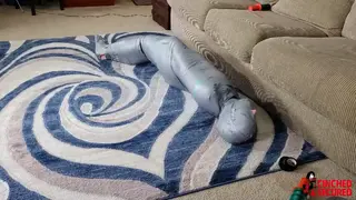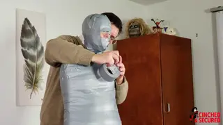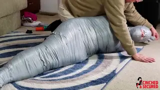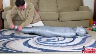 Rachel was counting on getting a good grade on her Masters Thesis, but unfortunately she had plagiarized the entire paper off an internet term paper collection. How could she know the paper had originally been written by her professor? Fortunately, the professor offered a choice. She could flunk out, or she could agree to be mummified as extra credit. If she could explain each step of the process, she would pass! She stripped completely nude before him, and stood nervously as her teacher wrapped her body in tight plastic wrap, not knowing that it would shrink as it grew warmer from her body temperature. Already immobilized, she could only watch as her teacher then added a layer of electrical tape! Now she was truly worried, but the professor added yet another layer to her cocoon, as casing of tight, gray duct tape! She was powerless to prevent him from cramming a huge mass of balled up pantyhose into her mouth, or to keep him from sealing it in place with the plastic wrap being wrapped until in sealed her entire head, save for her nose! Next came more duct tape and she whimpered as she felt her entire head being encased! Finally, she was laid on the floor and her feet were completely wrapped! Now nothing more than a featureless gray mummy with only her nose exposed, she struggled and strained, thrashing and fish flopping as she tried to escape! Then she got the truly horrible news. She would be sent on a study program to England where she would send six months on display as a mummy in a university!