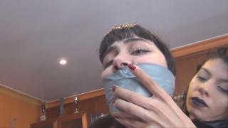两个身穿紧身衣的女窃贼加入了莉莉卡和娜拉的行列,她们现在联手作案,目标是下一个受害者!她们知道贝娅特丽克丝和茱莉亚家有很多钱和珠宝,所以目标显而易见。她们趁贝娅特丽克丝出门时偷袭了她。“什么……呜 ... “你怎么了!?”,“呜 ... The two catsuit burglars have joined Liricaa and Nala are now working together, and they are after their next victim! They know that in Beatrix and Julia's house there's a lot of money and jewells, so the target is obvious. They surprise Beatrix when she's leaving. “What.... MMMMMMMMMMMMMMPPPPPPPPPPPPHHHHHHHHHHHH!!!!!!!!!!!”. While one of the girls handgags her, the other starts to mummify her with plastic wrap. Each of her arms are covered separately, and then taped to the body, to make imposible any kind of movement. They gag her with a pair of socks and tape. Once she's mummified with plastic, is time for the tape. They cover her entire body with tape! Even the feet! But then the burglars hear something and run to hide. Julia just arrived home and she finds Beatrix mummified. “What happened to you!?”, “MMMMMMMMMMMMMMPPPPPPPPPPPPPPHHHHHHH!!!!!”. Beatrix tries to warn her, but she's gagged! The burglars Julia. She is stronger and resist more than Beatrix, but the burglars manage to submit her. Since she's resisiting that much, they tie her hands in the back. They gag her with socks and tape, and then she's completely mummified too! “MMMMMMMMMMMMMMMMPPPPPPPPPPPPPPPPHHHHHHHHHH!!!!!!!!!!!!”. Now the burglars are free to search around all the house, they don't have to worry about anything. The two victims are totally inmovilized, all the strugles are futile.