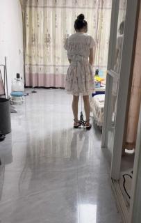 妹子很自觉的戴上脚镣,在屋子里里面干活,后来怕晚上吵到楼下的邻居,用绳子把脚镣链子提起来走路
