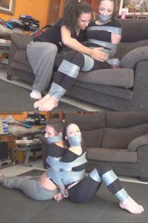 西比尔和维德玛是一对情侣,她们正在看一部电影,里面有个女子落难的场景。维德玛说她觉得当落难女子会很刺激,于是西比尔立刻拿来胶带。西比尔用胶带绑住了维德玛的手腕和脚踝,然后用袜子堵住她的嘴,再用胶带把她的嘴封得严严实实。维德玛发出呜呜的呻吟声,西比尔紧紧地把她缠起来。西比尔打了维德玛的屁股,这时她们的室友苏娅走了进来。苏娅很惊讶,但她很喜欢!她觉得也应该把西比尔绑起来堵住嘴。苏娅也用胶带把西比尔绑起来堵住嘴,然后打了她屁股。西比尔和维德玛一起发出愉悦的呜呜声,然后苏娅把她们背靠背地绑在一起。苏娅把这对情侣绑了好几个小时,让她们好好“增进感情”。Sibyl and Vedma are a couple watching a movie with a damsel in distress scene in it. Vedma mentions that she thinks being a damsel would be hot so Sibyl wastes no time and gets some duct tape. Sibyl tapes Vedma’s wrists and ankles and tapes her mouth good after gagging her with her socks. Vedma MMMMMPPPPPHHHHHs as Sibyl tightly tapes her body. Sibyl spanks Vedma as their roommate Sua walks in. Sua is sorprised, but she loves it! She thinks Sibyl should be tied up and gagged too. Sua tapes up and gags Sibyl before spanking her as well. Sibyl and Vedma MMMMMPPPPPHHHHH together in pleasure before Sua tapes them back to back. Sua leaves the couple taped up for hours of some much needed “bonding” time.