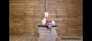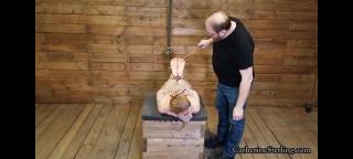 Catherine Sterling is tied up on a wooden box, Her dom walks in, deciding it’s time to tickle those temptingly trussed up toes. He tells the petite blond British babe “your socks stink, you must take them off before I come back or you’ll be in for hard bastinado”. Of course this unfair task is impossible in a tight box tie almost pulling elbows into a reverse prayer position, so when he comes back, he takes those offending socks off and with a cane issues a resounding swipe that the flexible but firm rod clean in half! Ms. Sterling squeals from her vulnerable position as the retort of the stinging strip across smarting bare feet rings through the room. The rope top and his masochistic rope bottom play a game: the slender girl gets warm up strokes to the soles, with an extra hard one every now and then. A number is assigned for each stroke: 1 doesn’t even tickle, 10 is Oww that’s her limit. But it is never that easy – as Catherine has been gagged with those dirty, smelly socks and vetwrap tape around her ponytailed head. With string he ties her big toes together. Then her legs are pulled up in the air and secured to a steel bar above. Your belly is on the bench but breasts hang over the edge