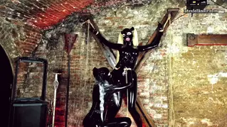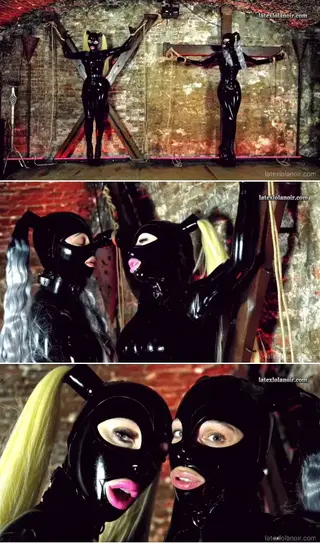 Me and my fellow rubber doll friend - Lizanne found ourselves tied up in the dungeons basement. First we struggled a little then Lizanne managed to escaped ! Instead of helping me out, she started playing with me. But the tables turned quickly. I’ve escaped, tied her back in and started teasing her pussy !