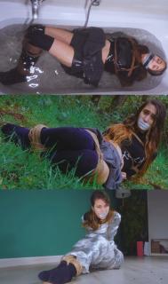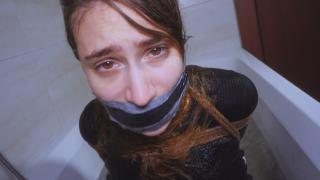 This time she changes the gag, takes one of her dirty socks and powerfully shoves it into Rey's mouth, closing it all with transparent tape. The final touch is placing Rey in the bathtub; now she's completely wet and has to hold herself up. The woman adds more layers of tape, making it an extreme gag.