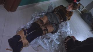 Once Rey is neutralized, she leaves her to struggle in the rain, soaking her clothes thoroughly, thus freezing her. Mmmmmp! Rey's desperate cries are punctuated by her shivering in the mud and leaves. It's getting dark, and the woman lifts Rey onto her shoulders and carries her away. Once inside the house, the woman throws her to the ground and places Rey on some plastic, covering her with dirt and mummifying her by rolling her in the plastic and applying tape on top.