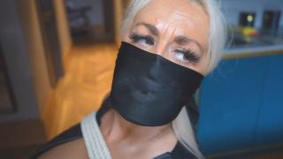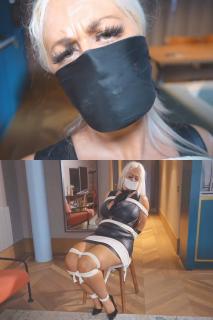性感金发熟女卡莉正准备参加一个以恋物癖为主题的聚会。她穿着紧身皮裙和高跟鞋,对着镜子摆姿势欣赏自己。摆完姿势后,她拿起一条黑色丝巾,卷起来紧紧地塞住自己的嘴。她再次对着镜子摆姿势,然后戴上一副性感的黑色长皮手套,回到镜子前,往自己丰满的嘴唇上涂上润唇膏。之后,她取下塞在嘴里的丝巾,系在脖子上。卡莉不知道的是,一个入侵者已经潜入了她的公寓,正埋伏在那里。卡莉打电话给姐妹们,告诉她们她很快就回来。卡莉走到前门,但还没来得及出门,就被人从背后袭击,一只手迅速捂住了她的嘴,把她拖回了走廊。卡莉发现自己被绳子绑在椅子上,动弹不得。她呼喊着要求闯入者放过她,但对方只是用手帕塞住她的嘴,又用一小条泡沫胶带封住手帕。男人消失不见,留下可怜的丰满熟女独自挣扎。过了一会儿,男人回来,扯下卡莉的围巾,给她戴上口鼻布。卡莉的尖叫声更加闷闷不乐,她再次挣扎,而施暴者又一次消失了。Super sexy blonde milf cally is getting ready for a girls night out at the location fetish event. Wearing her tight leather dress and heels she poses in the mirror and admires herself. After posing she grabs her black silk scarf and rolls it up and tightly cleave gags herself with it. Again she poses in the mirror before slipping some sexy long black leather gloves on and then returns to the mirror where she applieslistick over her hag lips. After this she removes the scarf from between her lips a ties it around her neck. What cally doesnt know is that an intruder has let himself into her apartment and lays in wait. Cally calls the girls and notifies them that she wont be long. Cally makes her way to the front door but befire she leaves she is jumped from behind and a hand is quickly clamped over her mouth and she is dragged back down the hallway. Cally now finds herself helplessly tied to a chair with plenty rope. She calls out to the intruder and requests her release but all this gets her is a handkerchief stuffed into her mouth and a strip of microfoam tape over the top to seal the cloth in. The man disappears and leaves the poor bust milf to struggle. After a while the man returns and removes callys neck scarf and gives her an over the mouth and nose gag. Now callys screams are muffled more and again left to struggle as the stranfer disappears once again