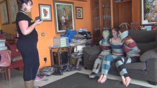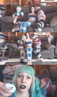 大学新学年开始了。许多新生开始了他们的大学生活。他们将在大学待上几年,所以加入一些“社团”是很正常的,比如足球俱乐部、电影俱乐部……但在这个校园里,有一个叫做“胶带俱乐部”的奇怪俱乐部。这是一个成员会被捆绑、堵嘴的俱乐部!基拉和玛古特是成员之一,她们需要招募新成员。今天有很多新生入学,这是她们的机会。但等待很无聊,所以基拉决定找点乐子,她把玛古特绑了起来。“我们边玩边等吧……”玛古特很喜欢这样。她被自己的袜子堵住了嘴,用胶带紧紧地绑了起来。基拉和玛古特玩耍,打她的屁股,玛古特很享受。她真是个变态!她们玩耍的时候,第一批学生到了。他们是德莱和丹妮。丹妮吓坏了,她很害怕,想离开。但德莱觉得这很有趣,想试试。她试图说服朋友留下来。“来吧,女孩,这看起来很有趣!”,“不,不。我不喜欢这种……嗯 ...丹妮快疯了!她被一群变态包围了!那些女孩还强吻她、搂抱她,但她只想逃离这里!可惜的是,她被绑了起来,嘴也被堵住了,哪儿也去不了!“呜 ...Its new year on college. A lot of new students start their first year. They are going to be there for a few years, so is normal in college to find “clubs” of friends, like a football club, movie club.... But in this campus, there's a weird club called the duct tape club. A club where people gets tied up and gagged! Kira and Margout are members, and they need to recruit new members for the club. Today a lot of new students arrive to campus, so its their opportunity. But waiting is boring, so Kira decides to have some fun and ties Margout. “Let's play while we wait....”. Margout loves that. She's gagged with her own socks and tied up tight with tape. Kira plays with Margout, spanks her, and Margout enjoys it. She's just a pervert! While they are playing, the first students arrive. They are Drai and Dany. Dany freaks out, she's scared and she wants to leave. But Drai finds it interesting and wants to try. She tries to convince her friend to stay. “C'mon girl, it seems to be funny!”, “No, no. I don't like this kind of..... MMMMMMMMMMMMMMMMMPPPPPPPPPPPPPPPPHHHHHHHHHHHH!!!!!!!!!!!!!”. Enough talking, Drai wants to try it anyway, so she handgags her and Kira ties her hands. The two girls tie Dany up and gag her with her socks. Dany isn't having a good time, she's struggling and moaning, but Drai is having so much fun! Seems she's a pervert too and she just found her place. “Now is your turn ^^”. Kira ties and gags Drai with her socks now. Drai enjoys being tied up and gagged too! The three girls are now tied up together. Drai and Margout are cuddling and gag-kissing, they are having so much fun! But Dany is freaking out! She's suronded by perverts! The girls gag-kiss and cuddle her too, but she's just trying to get the hell out of there! Unfortunately for her, she's all tied up and gagged, she's not going anywhere! “MMMMMMMMMMMMMMMMMMPPPPPPPPPPPPPPPHHHHHHHHHHHHHH!!!!!!!!!!!!!!!!!!!!!!!!!”.
