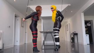 Before they can devise a plan, the villain reveals himself, catching the heroines off guard. Within moments, Kiki and Latina find themselves ball-gagged and restrained in the strappado position – their once-invincible powers now stripped away.