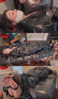 Volunteer has returned for a third round of testing. Again placed into the bag, she is thoroughly strapped in, despite her small stature. She isn’t to be underestimated and will in fact test the bondage she is placed in.