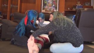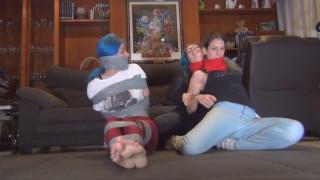 米赫正安安静静地在家里用智能手机发短信,她完全没注意到两名窃贼已潜入屋内。突然,她遭到袭击。西比尔用手捂住她的嘴,利瓦伊则用胶带捆住她的双手。窃贼们知道米赫尔藏有巨款,意图洗劫一空。他们扯下米赫尔的袜子塞进她嘴里,又用宽胶带封住她的嘴。米赫尔浑身被胶带缠得动弹不得,憋得快要窒息!但最后的惊喜还在后头——正当西比尔玩弄受害者时,利瓦伊从背后袭击她,反将她双手捆住!“你以为你在干什么?!”,“抱歉我不信任你。我知道你曾背叛过别人,所以我要绑住你把钱据为己有”。"你敢还被袜子和巨型胶带堵住嘴。待两位女士被彻底捆缚封口后,利瓦伊对她们施加羞辱并取乐一番。随后她离开去搜寻赃款。女孩们被困在原地,完全束手无策。她们拼命挣扎却徒劳无功,只能愈发陷入绝望!..Mhere is peacefully at her home texting in her smartphone. She hasn't noticed that two burglars have sneaked into her house. Suddenly, she's attacked. Sibyl handgags her while Livay ties her hands with tape. “MMMMMMMMMMMPPPPPPPPPHHHHH!!!!!!!!”. The burglars know that Mhere has a lot of money, and they intend to steal it all. They remove Mhere's socks and put them into her mouth. Then they gag her with a huge tapegag. Mhere is tied up with a lot of tape. She's so frustated! But there's one last surprise. While Sibyl is playing with her victim, Livay attacks her from behind and ties her hands! “What do you think are you doing?!”, “Sorry, I don't trust you. I know you've betrayed other people before, so I'll tie you up and keep the money for me”. “Don't you dare.... MMMMMMMMMMMMMMPPPPPPPPPPPHHHHH!!!!!!!”. Sibyl is also gagged with her socks and a huge tapegag. Once the two ladies are all tied up and gagged, Livay humiliates them and have some fun. Then she leaves to search for the loot. The girls are left there, totally helpless. They struggle all they can, but is futile. They just keep getting more frustated!