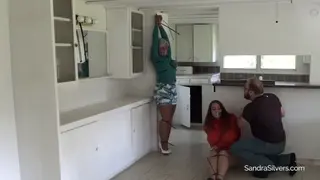 The voluptuous, silver-haired, Sandra, was first. He drags the duct tape gagged milf in by her zip tied wrists. Another zip tie is added between her hands and a hook, pulling her arms far over her head. He takes his time zip tying her tits, knees and ankles. He's not done with her, but leaves momentarily as she dangles in her high heels while he gets his second victim from the truck. The amazon redhead, Ruth, is next. He's got her hands zip tied behind her back and a fistful of her flaming locks. She's pushed to the floor and is treated to a similar cinching as Sandra around her massive mammaries and long legs. He carries lithe and limber AJ in over his shoulder. She is already zip tied and wrists and ankles. Tossing her onto the counter, he denies her the relative comfort of her position and with a few more ties, he hobbles the high-heeled hottie into a hogtie. Each of his hostages have vastly different sized breasts, but each is also a perfect paragon of their size. And he wants a peek.
