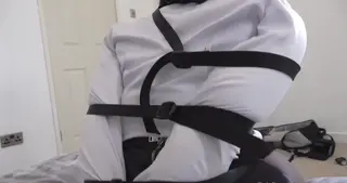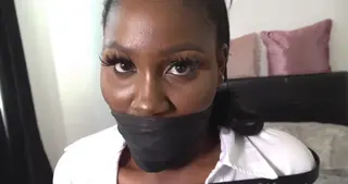 Returning home from a long day at work sexy submissive babe zippy loves nothi g more than being restrained by her master. We first see the ebony beauty bound hand and foot on the edge of the bed where she has been told to wait. Straps bind her wrists, legs and body very tightly with her cleavage bulging out her blouse. She has a black scarf filmy tied around her mouth to keep her quiet. After a while of groaning and squirming on the edge of the bed we next see poor zippy kneeling on the bed but this time her secretary clothes have been removed and she is now in her black lingerie, stockings and heels. Her scarf gag has been removed and now replaced with a tight ballgag. She squirms on the bed all playfully for her master, her body and wrists still bound a drool pouring from her luscious plunp lips. We cant have her making a mess now can we so her master makes sure she doesn't drool over her sexy full figured body by wrapping vet wrap around her ball gagged mouth, preventing and saliva escaping her mouth. Now helpless and unable so speak she is left all frustrated and horny on the bed as she stares continuously into the camera with her big puppy eyes
