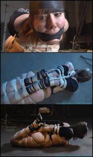 This clip starts where Part 2 ended. I walk up behind her with a huge cleaning sponge. Yes, it will soon be used to muffle Riley's cute little moans. It is stuffed in her willing mouth and then many wraps of black vetwrap hold it in. Her elbows are tied. not completely together, but pretty close. More ropes are wrapped around her arms and her body and then cinched. I put her on the hard cold concrete floor and make her struggle for our enjoyment. I'm not satisfied with her effort though and when that happens, the bondage gets tighter. I hogtie Riley next. I have a little extra rope, so I loop it under her crotchrope, which tightens it back up the way it should be. I leave her to moan and struggle for a short while. I decide to use the rest of the vetwrap. I wrap it around her forehead and back to the hogtie connecting rope to keep her looking straight ahead and the make her bondage a bit more restrictive. I leave her on her stomach, but eventually I return and roll her onto her side so we can get a better look at her bound tits. All she can do is "mmmpphh" moan and endure the bondage until I decide to let her go. She starts gagging on the sponge in her mouth, so I grab it and yank it out past the vetwrap. The vetwrap cleave, still makes a very effective gag, even without the sponge. I stand above her and slap grope her tits for a while longer. Riley is ready to be let out now, so I tell her I want to hear some begging. She does her best gagtalk/begging and I finally give in and start to free her. There is a few minutes of footage at the end where Riley is being freed.
