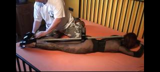 Melanie looks incredibly sexy wearing a black panty suit in this session. I proposed a challenge: try to escape the new method I will use to subdue her. Melanie confidently accepts. What she doesn't know is that I will put a strong bra on her arms and a metal pipe in the middle of her body face down to prevent her from freeing herself so easily. Once subdued face down, the challenge begins for Melanie, and of course, a huge ball gag. Melanie will not be able to escape this one.