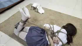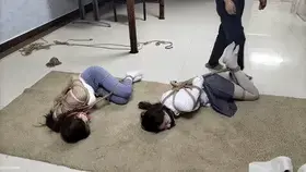 惩罚结束之后,男人将黄珊珊放下来,将双脚给绑上,然后给绑成驷马,便离开了。黄珊珊与杨丽娜挣扎,最终在黄珊珊的帮助下,杨丽娜身上的拘束衣被打了,但是杨丽娜并没有给黄珊珊解开绳子,而是将一副手铐脚镣戴在了黄珊珊的手脚上,便独自离开了。