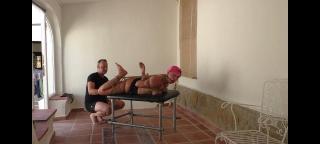 We will set the limits for our model Nova by tying her arms, back, and legs very tightly with ropes, restricting her movement. To increase the challenge, Nova will have to remain tied up on a rather small table for the entire session, preventing her from making any sudden movements or she will fall. Once the ball gag is placed in her mouth, I forgot to mention that I will use a spanking board to stimulate her during the challenge. Poor Nova, tied up and immobilized, can only moan under the spanking.