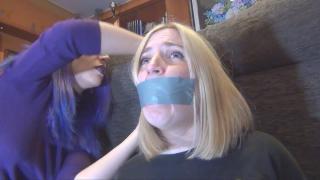 莉兹·雷恩博在社交网络上非常活跃。她有时会和人发生争执。但这次她真的生气了。她刚刚和简·琼斯以及伦诺克斯吵了一架,而且吵得很凶。她们互相辱骂,还互相威胁。大多数情况下,这种争吵就此结束,只在网上解决。但这次莉兹真的生气了!她闯进了简和伦诺克斯的家。看看她们有没有胆子当面跟她说这些。第一个到的是简·琼斯。“你他妈在这儿干什么?!”“你为什么不现在就告诉我你在网上跟我说了什么?”争吵最终以莉兹殴打简并用胶带绑住她的双手而告终。“你这个婊子……你干什么!!!!!!!”莉兹捂住了简的嘴。她脱下简·琼斯的袜子塞进她的嘴里,然后用巨大的胶带封住了她的嘴。她用胶带把简·琼斯绑得紧紧的。 “现在你没那么勇敢了吧?”“啊 ...Liz Rainbow is very active in social networks. Sometimes, she gets into arguments with people. But this time she's really pissed off. She just had a discussion with Jane Jones and Lennox, a really bad one. They insulted each other and made threats. Most of times this ends just there, on the internet. But this time Liz is really pissed off! She breaks into Jane and Lennox house. Let's see if they are brave enough to tell all that to her face. First one in arrive is Jane Jones. “WTF are you doing here?!”, “Why don't you tell me now what you told me online huh?”. The discussion ends with Liz assaulting Jane and tying up her hands with tape. “What are you doing you b..... MMMMMMMMPPPPPPPHHHHHHHH!!!!!!!!!!”. Liz handgags her. She removes Jane Jones's socks and puts them into her mouth, then she gags her with a huge tapegag. She ties Jane Jones really tight with tape. “Now you aren't so brave, dont you?”, “MMMMMMMMMMPPPPPPPHHHHHH!!!!!!!!!!!”. Jane Jones is so angry! When Liz hears the door, she hides quickly. Lennox arrives and sees her partner tied up and gagged. She jumps to help her, but she's assaulted from behind by Liz. She's also gagged with her socks and tied up with tape. Now that she has her two enemies tied up and gagged is time for vengeance. Liz Rainbow makes fun of them and humiliates them. She even takes pictures to post them online! The girls are so frustrated! There's nothing they can't do, just see how Liz humiliates them. When Liz decides to leave, the girls freak out! She leaves them tied up and gagged, totally helpless! Whats gonna happen to them?!