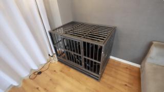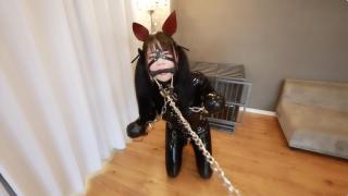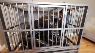 人犬小奴被主人调教,从笼子里牵出来,踢踩踹,再用快乐棒强高折磨。