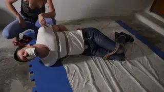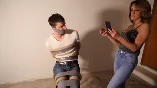 Next scene James is tied on a chair with ropes and tape, Alba change his gag, takes some pictures of him and then she leaves.... what is going to happen to happen to James poor?一名男子被捆绑、堵嘴并蒙上眼睛,被扣为人质。视频片段就是这样开始的。