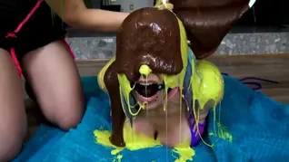 Mud Bunny is lead into the room on a leash by her hot friend. Gagged and tried she struggles on the floor as bright green and chocolate slime is poured and rubbed all over. Left to struggle her way out of the sticky mess Mud Bunny eventually breaks out of her binds still covered in slime.