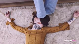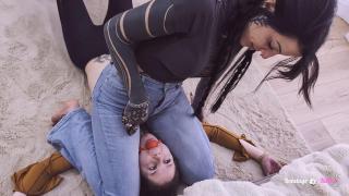 Finally, Dolly replaces the ballgag. Then she sits comfortably on the sofa. She rests her feet on Aly's face and uses her as a footrest while reading a book.Aly stays restrained beneath her. Silent. Helpless.