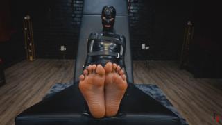 随着镜头切换到侧面,我加大了力度。安娜尖叫着,笑着,无法控制。Anna Luna is strapped to a bench, tightly secured in latex with her mouth sealed by a matching latex panel. Her bare feet are exposed, and I approach to begin tickling them.